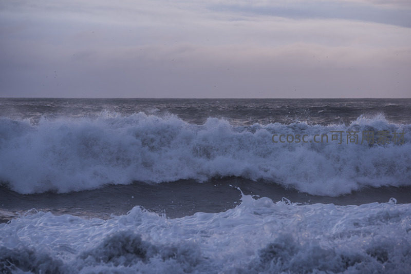 在黄昏的微光中,深色的海面翻腾着巨大的波浪,浪尖破碎成雪白泡沫,描绘出一幅充满动感与张力的自然画卷。