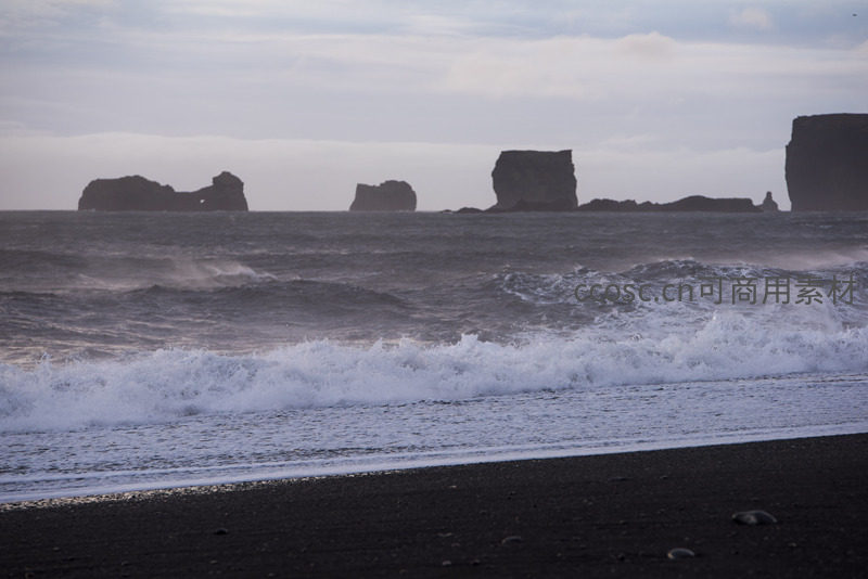 黑沙滩前浪花翻滚,远处礁石如沉默巨人