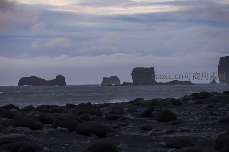 黄昏时分,海面上的岩石群化作深色剪影,前景是散落的黑色卵石滩,微弱光线勾勒轮廓,海风轻拂,整个画面弥漫着宁静、孤寂的诗意美感。
