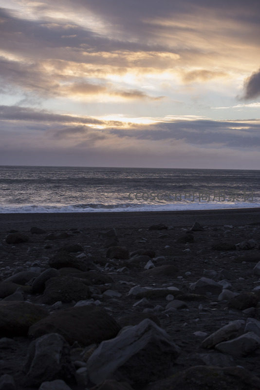 夕阳西下,海面泛起粼粼波光,云层如画布般铺展,黑沙滩上散落着大小不一的岩石,天地间弥漫着温柔而沉静的氛围。