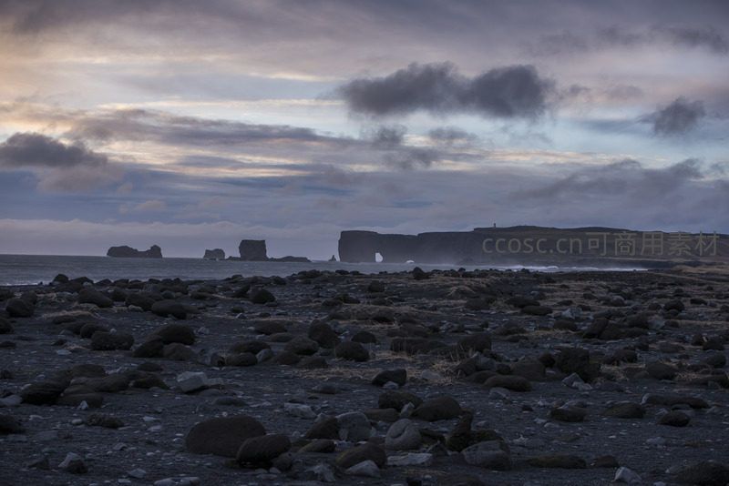 远方矗立着著名的海蚀拱门地貌,云雾缭绕其间,近处黑沙与碎石铺陈,整幅画面充满神秘感与自然力量,宛如神话中的秘境。