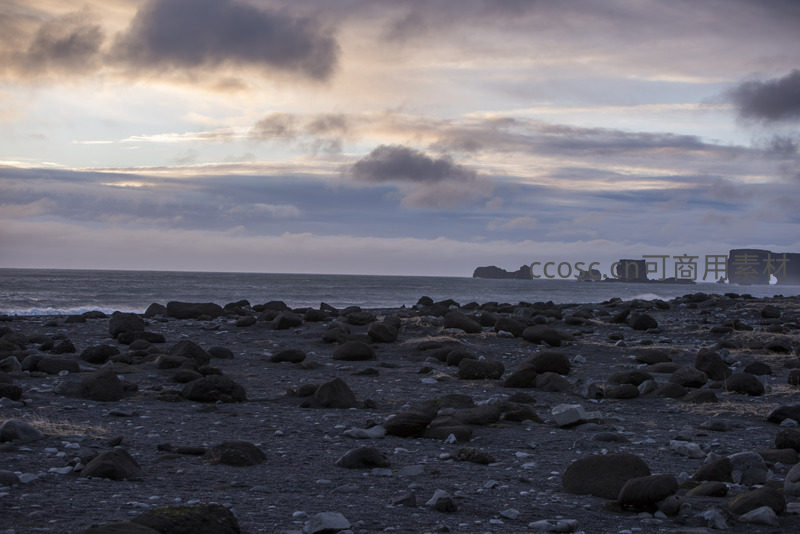 广袤黑沙滩延伸至天际,远处几座孤岛礁石静立海中,天空云层厚重却透出柔光,营造出苍茫辽阔又安详的自然画卷。