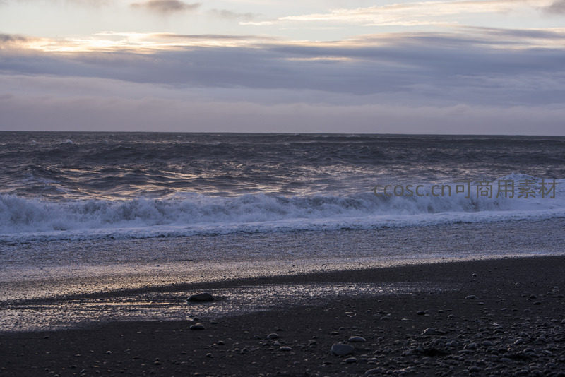 暮色海浪轻抚黑沙岸滩