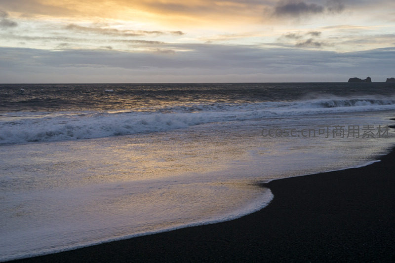 夕阳将天际染成金黄,海浪温柔拍打黑色沙滩,水光潋滟,形成梦幻般的倒影,远处礁石轮廓清晰,整个场景充满诗意与浪漫气息。