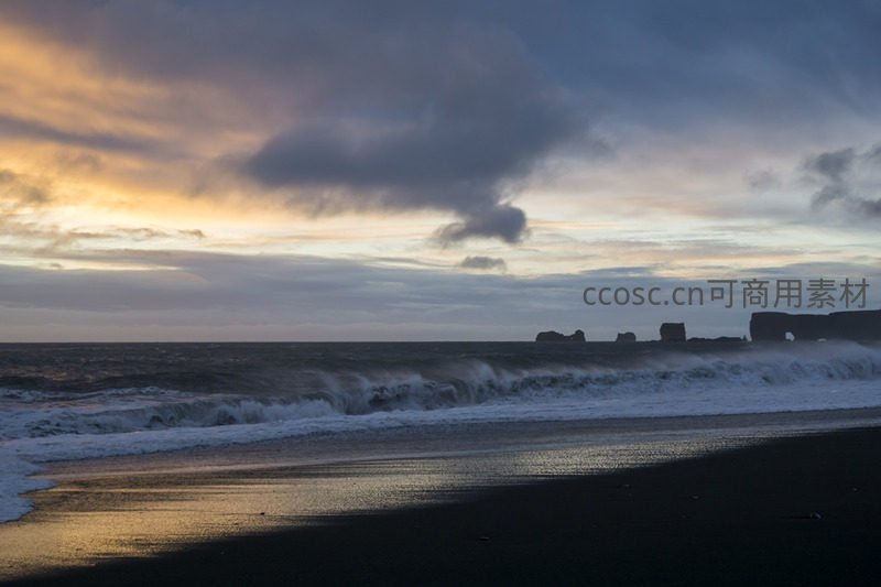 黑沙滩日落,海浪拍岸云霞绚烂