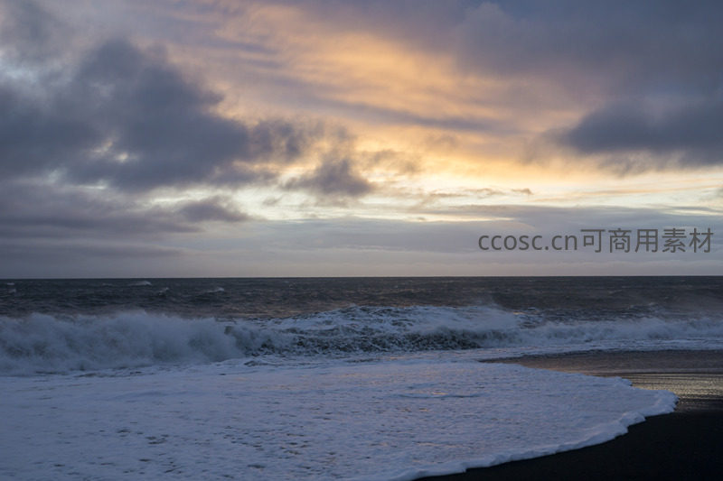 乌云密布的天空下,狂风掀起巨浪猛烈冲击着黑色沙滩,白色的泡沫铺满滩涂,预示着一场风暴即将来临,气势磅礴令人震撼。