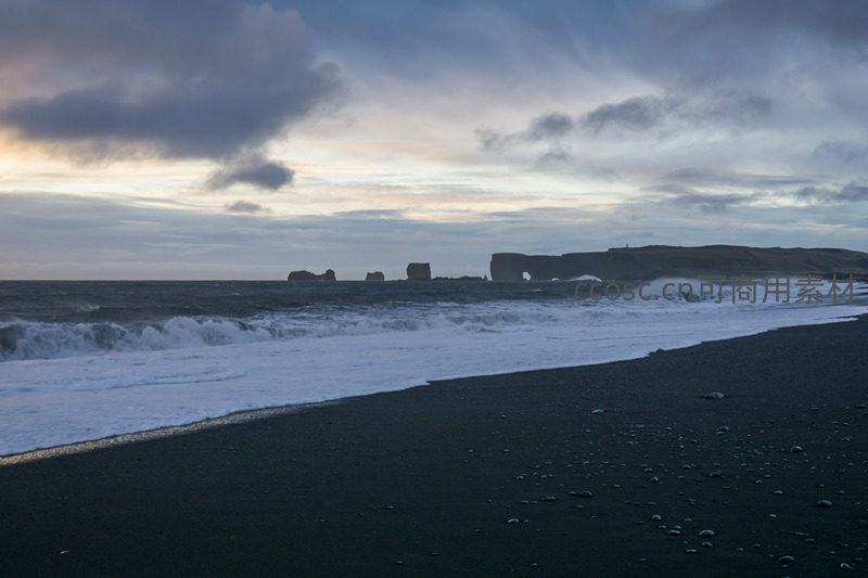 暮色渐浓,黑沙滩在余晖中泛着微光,层层海浪不断涌向岸边,远方的悬崖和礁石化作深色剪影,天空云层变幻莫测,营造出一种苍茫而诗意的氛围。
