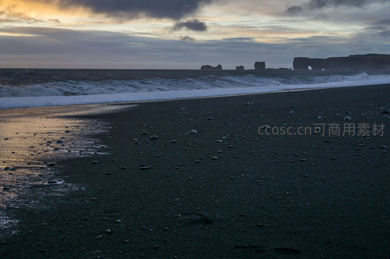 潮水退去后,湿润的黑沙反射着天边残存的霞光,细小的贝壳散落其间,海浪声此起彼伏,整个画面弥漫着孤独而平和的气息,是远离喧嚣的理想之地。