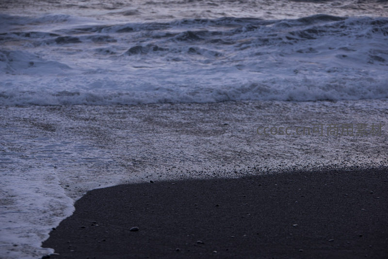 在天色将暗未暗之际,镜头聚焦于黑沙滩边缘,细腻的沙粒与翻涌的白色浪花形成强烈对比,泡沫在沙滩上短暂驻足后消散,留下湿润的印记与无尽遐想。