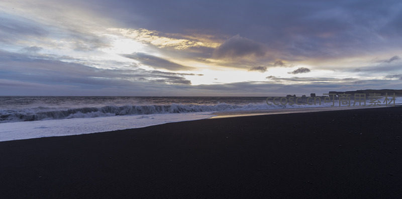 黑沙滩日落,海浪轻抚海岸线