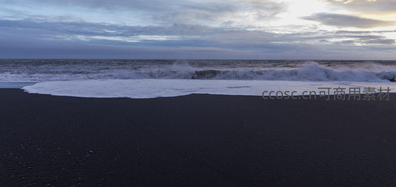 深色火山砂砾铺就的沙滩与澎湃的白色浪花形成强烈对比,天空阴云密布却透出微光,营造出神秘而壮阔的氛围。