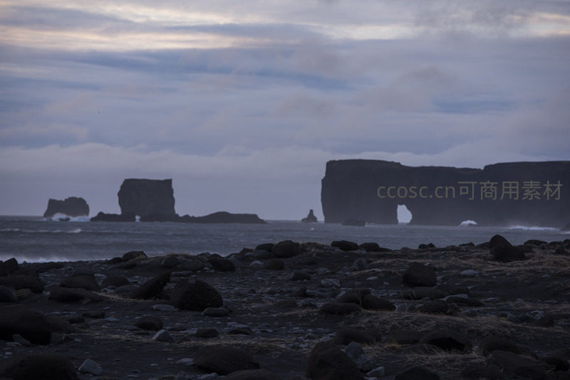 在灰蓝色的天幕下,远处海中矗立着形态各异的岩石,其中一座天然拱门格外醒目,近处散落着大小不一的玄武岩。