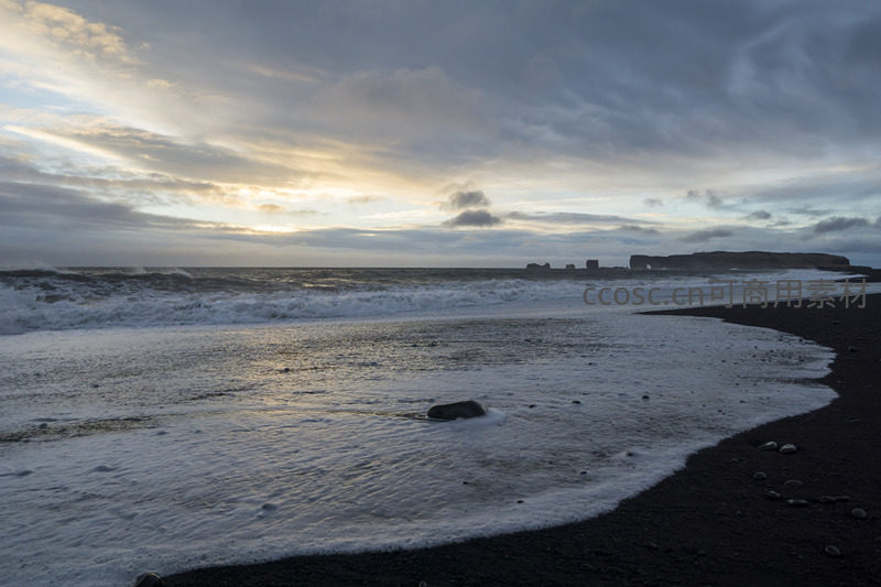 波涛退去后,湿润的黑沙映照着天空的余晖,泡沫如薄纱覆盖其上,远处海岸线轮廓分明,构成一幅静谧而富有诗意的画面。