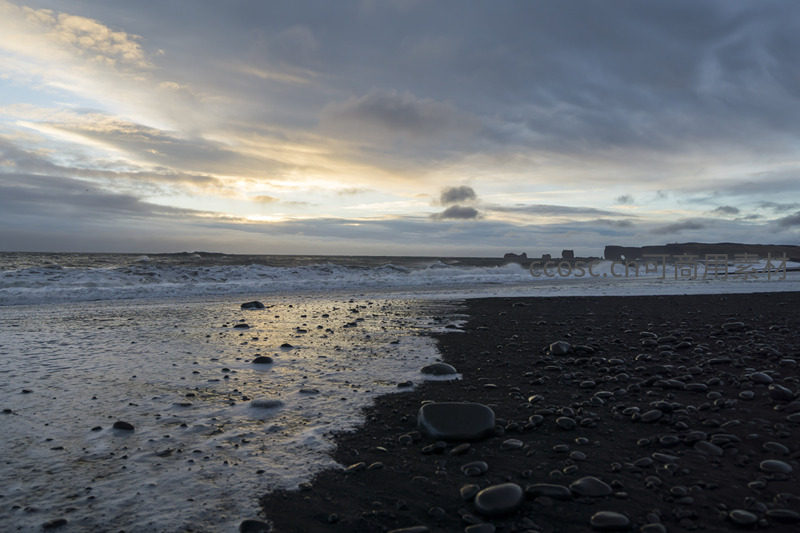 湿润的黑色沙滩上散落着光滑卵石,海浪温柔退去留下薄薄水膜,反射着天边最后一缕金光,营造出宁静致远的黄昏氛围。