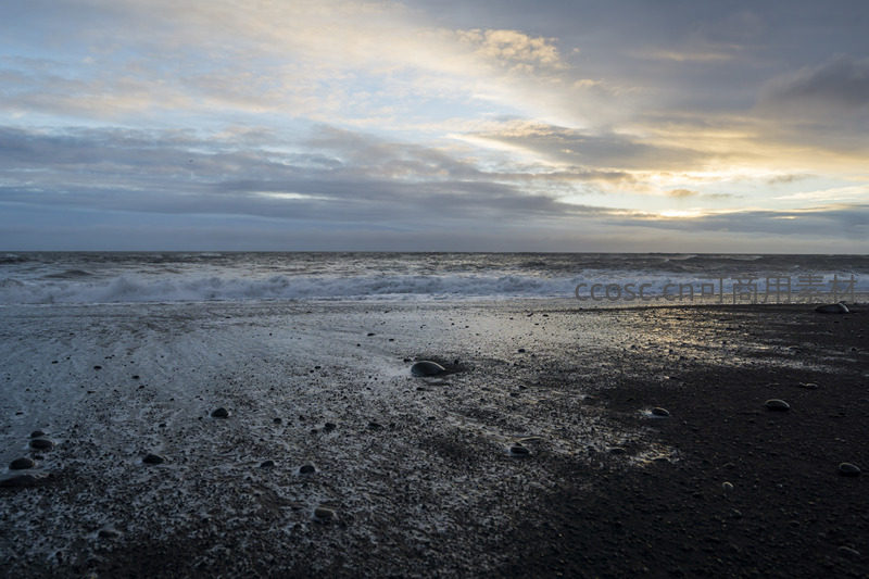 无垠大海与辽阔天空相接,海浪轻柔拍打着平坦的黑色沙滩,湿润沙面映照着云影,展现大自然沉静、广袤且富有质感的美。