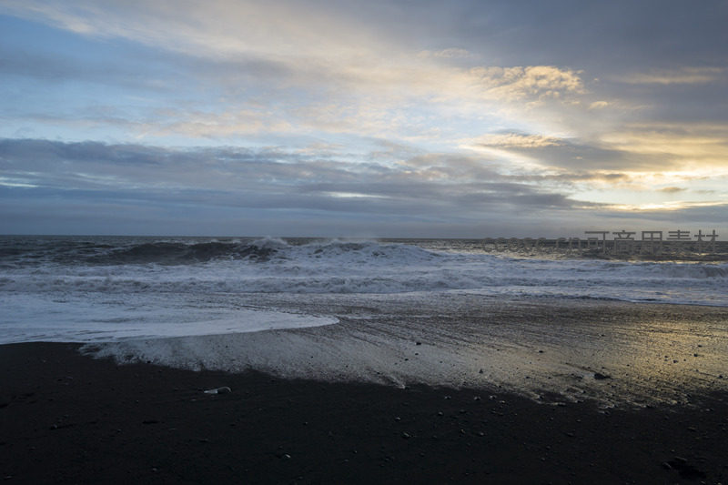 深色的火山砂与洁白的泡沫浪花形成鲜明视觉冲击,远处海平面被夕阳染成暖色调,天空中云朵飘逸,整幅画面动静结合,展现海洋的原始魅力与自然之美。