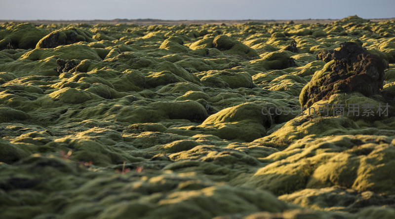 阳光洒在被浓密苔藓覆盖的黑色火山岩上,形成一片起伏的绿色地毯,展现出原始而宁静的自然之美。