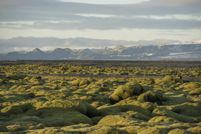 前景是如地毯般铺展的绿色苔原,背景是白雪皑皑的巍峨雪山,天空云层流动,构成一幅层次分明、色彩对比强烈的壮丽自然画卷。
