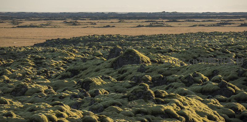 广袤的火山岩被翠绿苔藓温柔覆盖,阳光洒落形成明暗交错的纹理,远处地平线与天空相接,展现原始而宁静的自然力量。