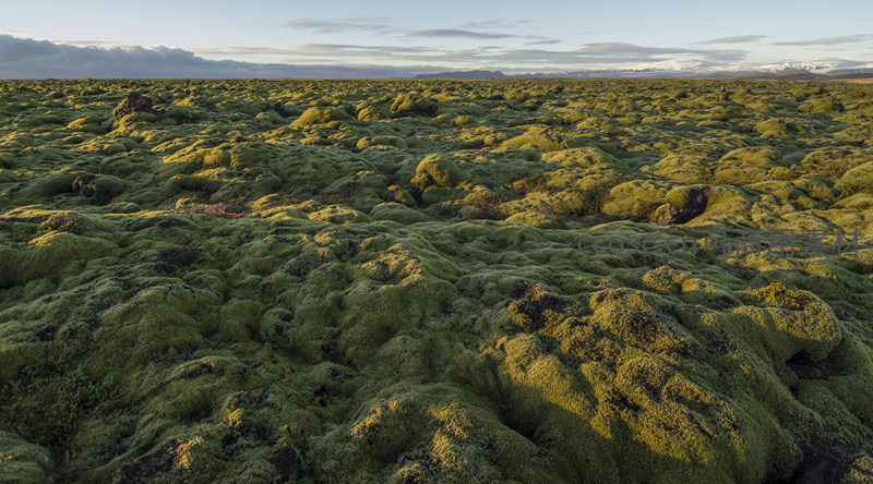 一望无际的苔藓原野沐浴在柔和的晨光里,起伏的绿色绒毯一直延伸至远方的地平线,远处雪山若隐若现,静谧而壮阔。