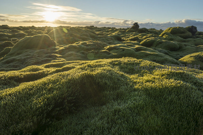 太阳从地平线缓缓升起,温暖的光线穿透薄云,洒落在无垠的苔藓原野上,营造出神圣而宁静的氛围,令人心旷神怡。