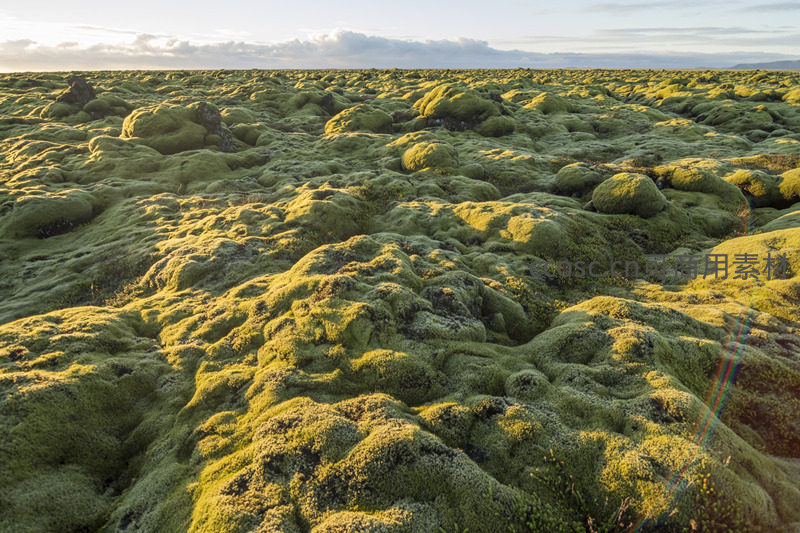 午后阳光穿透薄云,斜射在这片被苔藓覆盖的古老土地上,光束与阴影交织,赋予了这片荒芜之地以温暖和生命,构成一幅动人心魄的自然杰作。
