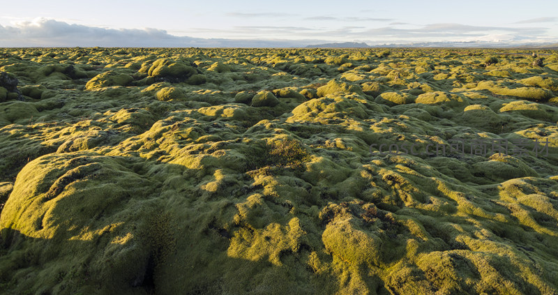 广袤无垠的火山熔岩原被厚厚的绿色苔藓温柔覆盖,阳光斜照勾勒出起伏的纹理,展现出冰岛特有的原始生态与静谧之美。