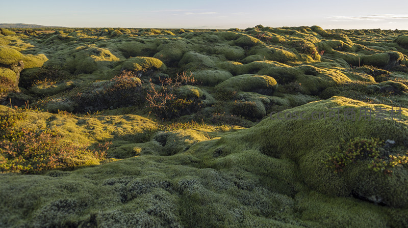 柔和的晨光洒在连绵不绝的苔藓覆盖地上,形成一片如梦似幻的绿色海洋,远处地平线清晰可见,尽显大自然的鬼斧神工。