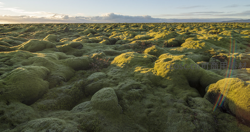 苔藓覆盖的熔岩原野在夕阳下熠熠生辉