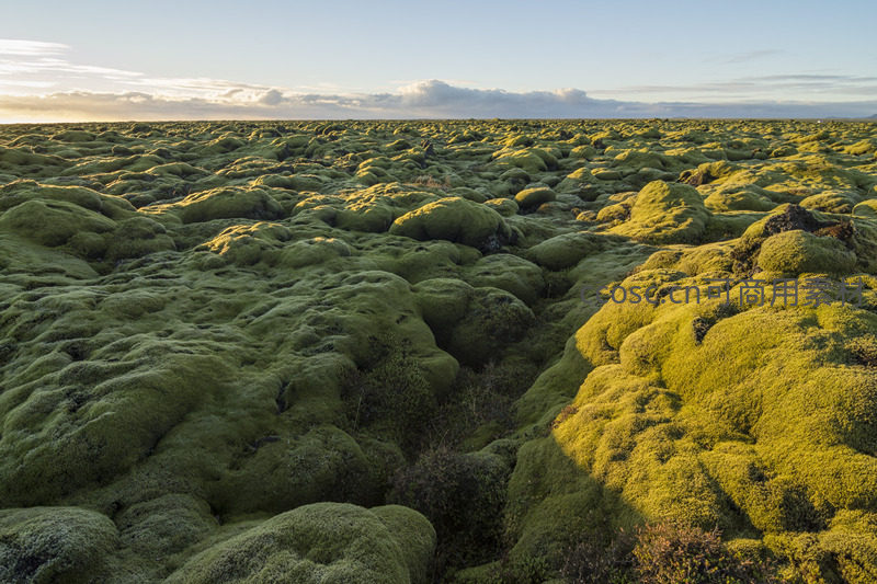 晨曦初露,无边无际的苔藓原野在柔和光线中泛起层层叠叠的翠绿波浪,光影交错间凸显地形起伏,营造出空灵、纯净且充满原始力量的视觉体验。