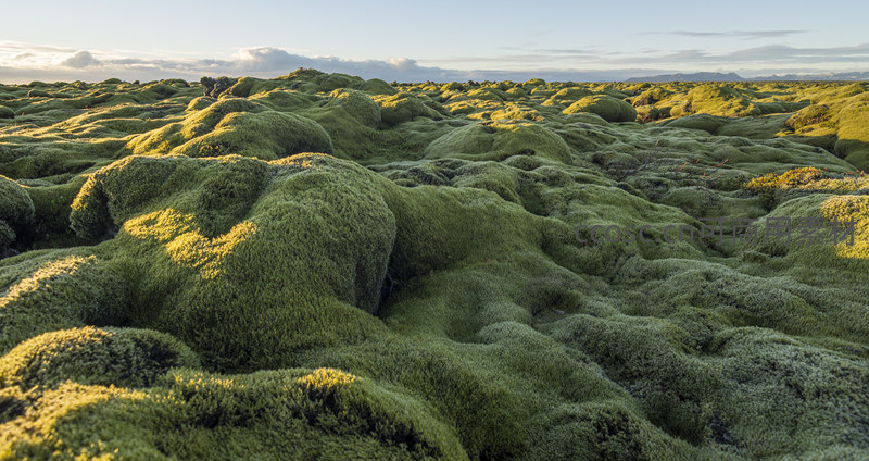 广袤无垠的苔原在夕阳下泛着金光,如绿色的海洋般起伏连绵,每一处褶皱都诉说着地质变迁与生命演替的无声史诗。