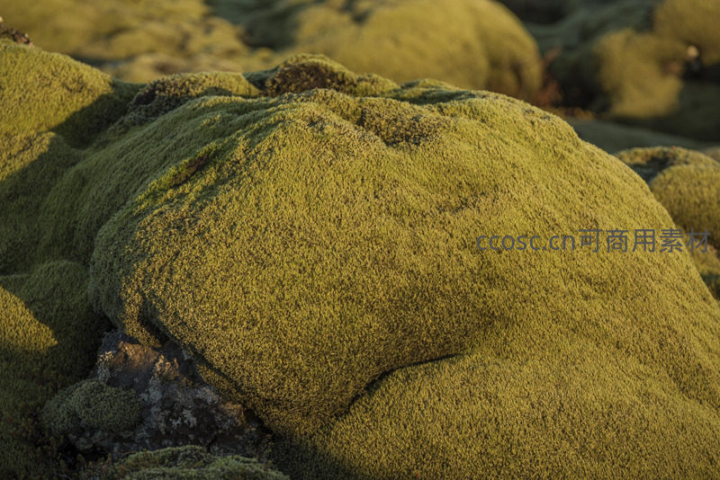 一块巨大的岩石被浓密的青苔完全包裹,阳光从侧面投射,在青苔表面形成丰富的明暗过渡,凸显了其蓬松柔软的质感和自然生长的形态。