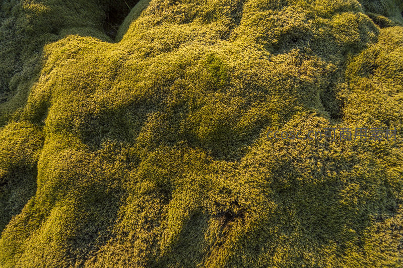 斜射阳光穿过密集苔藓,在其表面投下斑驳金光,形成柔和过渡与立体感,赋予画面温暖氛围和视觉深度。