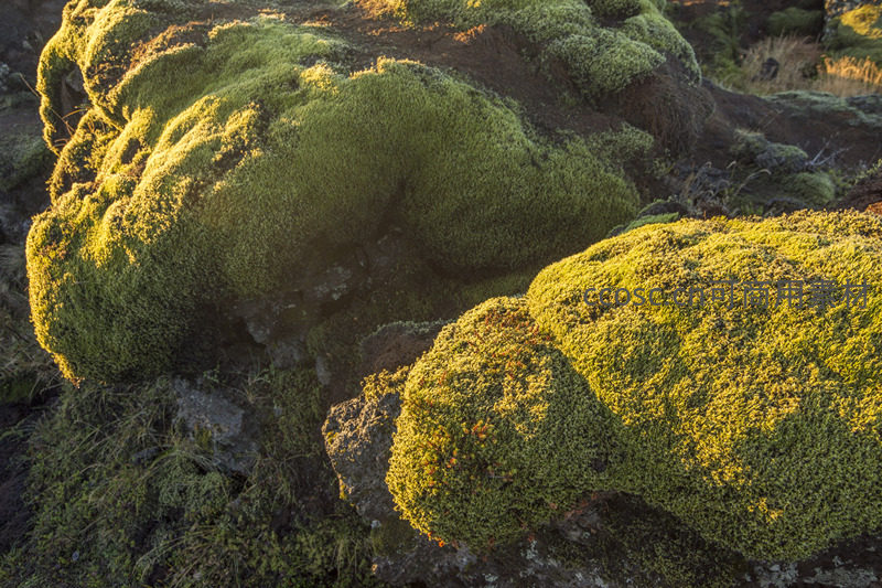 形态各异的岩石被厚实苔藓温柔包裹,晨光为它们镀上金边,宛如大地的艺术品,诉说着时间与自然的和谐共生。