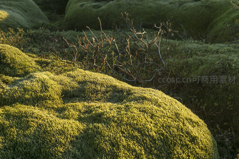 温暖的阳光洒在覆盖着厚厚苔藓的岩石上,形成明暗交错的视觉效果,展现出大自然鬼斧神工般的细腻纹理与生机勃勃的绿意。