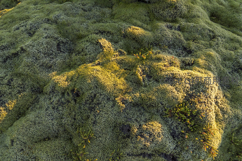 阳光斜照下,大片苔藓如绿毯般覆盖在崎岖的火山岩上,形成独特的自然纹理与生机勃勃的生态景观。