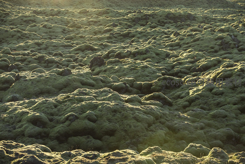 从高处俯瞰,连绵起伏的苔藓覆盖火山岩形成波浪般的绿色海洋,展现出大自然鬼斧神工的壮丽景象。