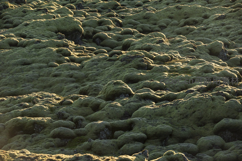 阳光斜照下,大片苔藓如绿毯般覆盖在崎岖的火山岩上,形成独特而富有生命力的地貌景观。
