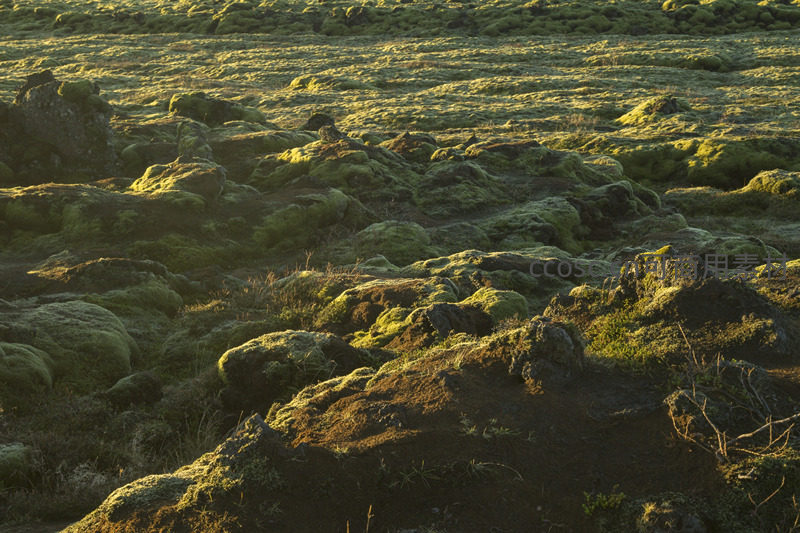 辽阔的苔原被柔和的晨光轻抚,层层叠叠的绿色苔藓如地毯般铺满大地,营造出宁静、空旷又充满生机的自然画卷。