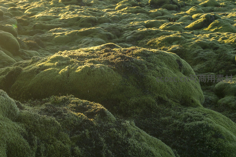 近距离捕捉苔藓覆盖的岩石表面,细腻如绒毯般的质感在斜射阳光下熠熠生辉,展现微观世界中蕴藏的自然韵律与柔美。