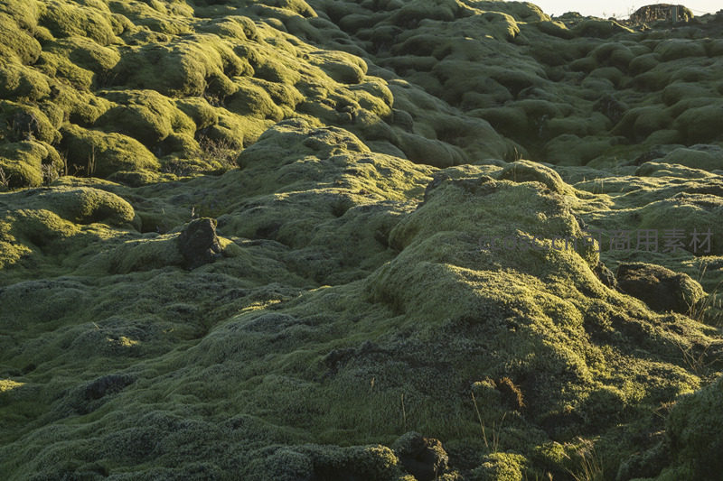 连绵苔藓丘陵在夕阳下泛着金绿光泽