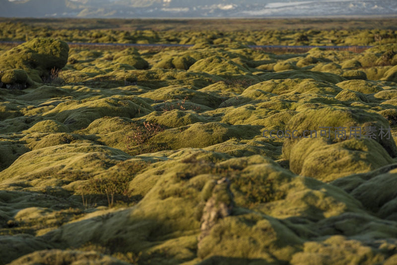 在温暖阳光的照射下,广袤的火山岩被厚厚的绿色苔藓温柔覆盖,形成一片起伏的柔软地毯,远处山峦与天空相接,静谧而壮丽。