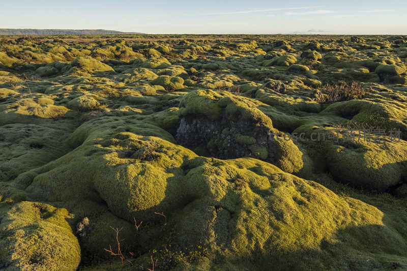 巨大的火山岩被柔软苔藓层层包裹,在斜阳下显露出斑驳肌理与温润色泽,坚硬与柔韧交融,诉说着时间沉淀下自然力量的温柔雕琢。