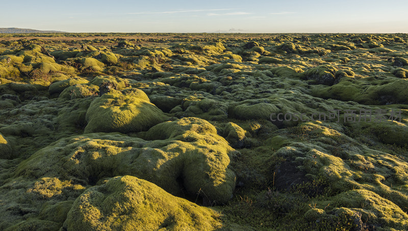 阳光洒在被浓密苔藓覆盖的火山岩上,形成明暗交错的绿色地毯,展现出原始而宁静的自然之美。