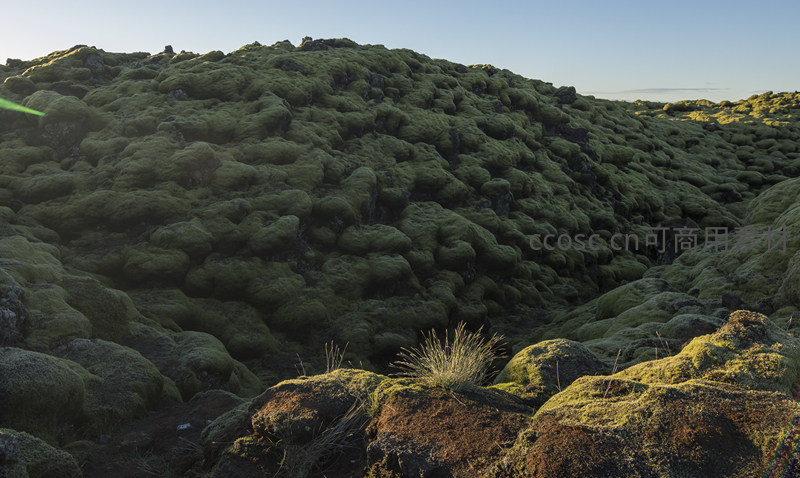 苔藓覆盖的火山岩地貌在夕阳下泛着绿光