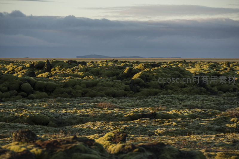在阴云密布的傍晚,大片苔藓覆盖的岩石原野沐浴在柔和的余晖中,远山轮廓朦胧,天空云层厚重,整个画面弥漫着沉静、神秘而富有诗意的氛围。
