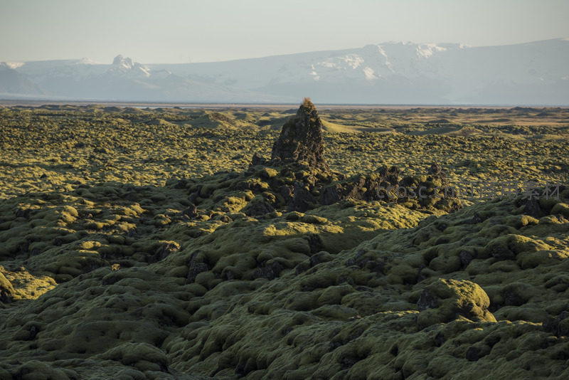 一片无垠的苔藓平原中矗立着一座孤峰,背景是朦胧的雪山与天际线,光线柔和,营造出空旷、静谧且充满生命力的自然画卷。