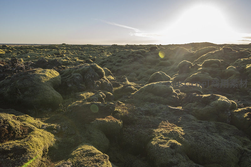 苔藓覆盖的火山岩在夕阳下熠熠生辉