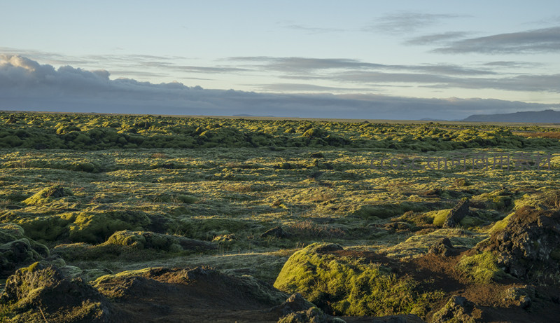 苔藓覆盖的火山地貌在柔和光线下延展