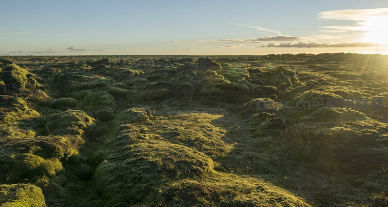 苔藓覆盖的火山岩地貌在夕阳下熠熠生辉
